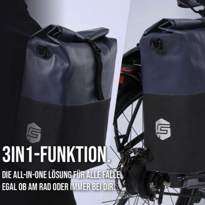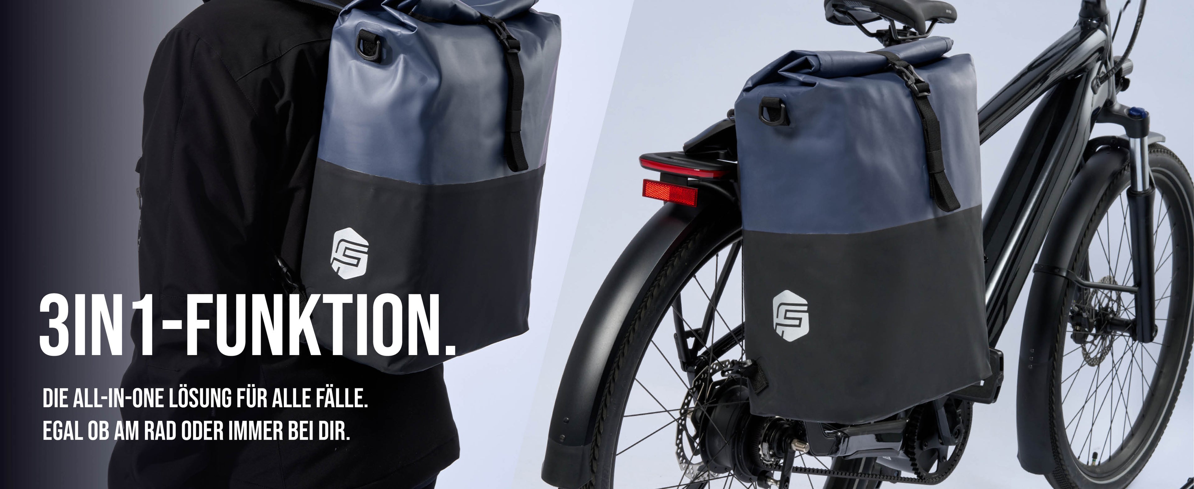 Maximale Flexibilität! Unsere3-in-1 Taschen lassen sich als Seitentasche, Gepäckträgertasche oder Rucksack nutzen. Vielseitig, robust und perfekt für unterwegs.
